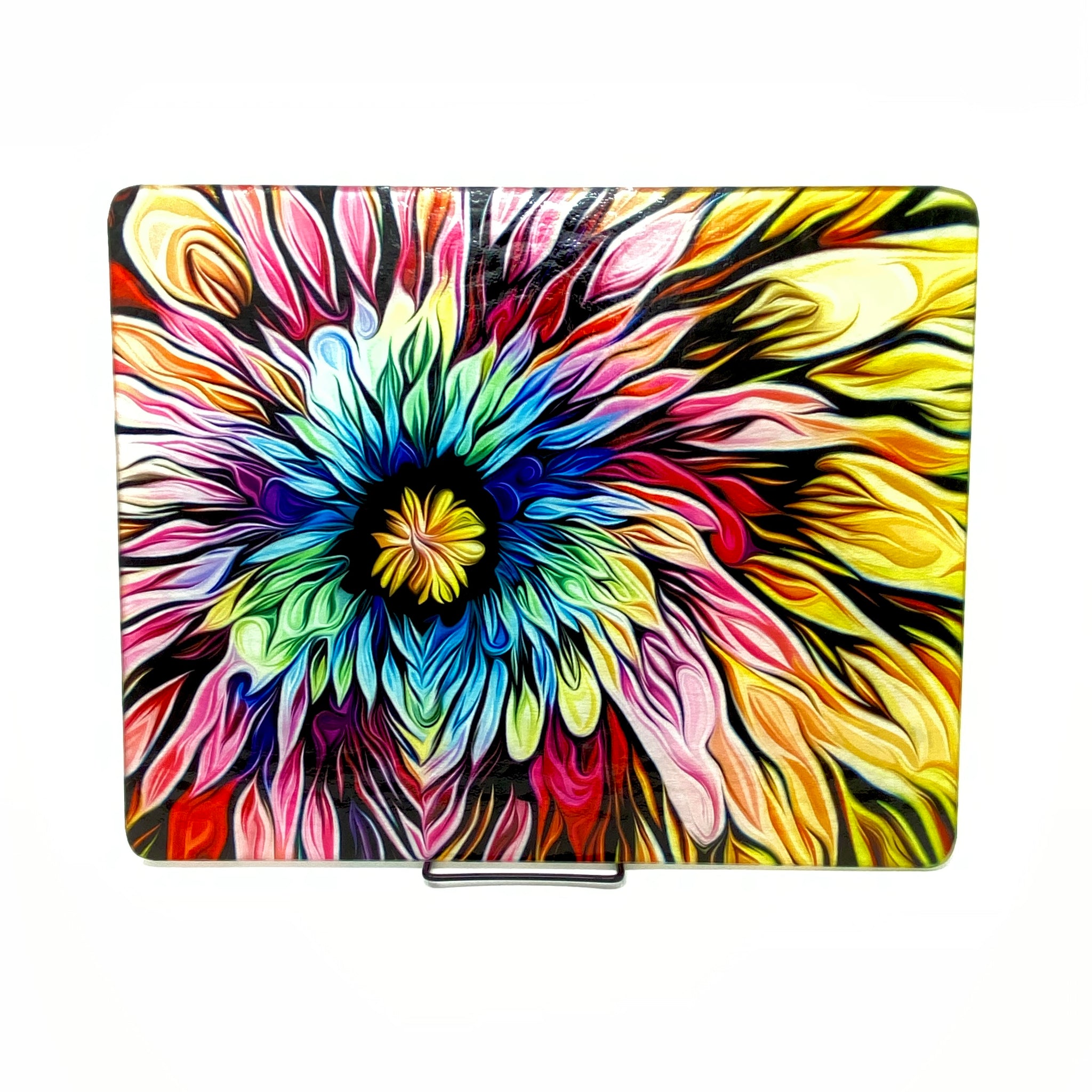 Insanely colorful textured and tempered glass cutting boards. Round or rectangle. Made to order, so they're always in stock!